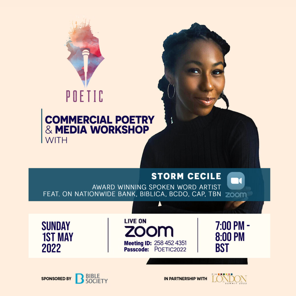 Storm Cecile will host a free Commercial Poetry & Media Workshop on Sunday 1st May for all those interested in learning the craft or just gathering as a community. The workshop is part of the Bible Society sponsored Poetic activities which culminates in PIA London Summit 2022 on the 7th May in London.