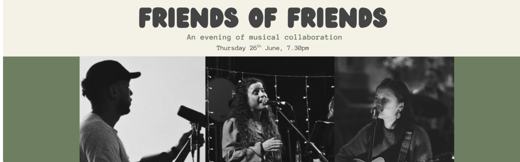 Friends of Friends brings together three friends and artists — Jemimah Paine, Murray Reid and Zoë Grace Wang — for a heartfelt acoustic evening. Come hear songs from each of their latest projects, trio covers, unreleased songs and more. Doors open at 7pm Tickets can be bought on the door Friends of Friends playlist: https://open.spotify.com/playlist/5Bz01KhqWtah3FWfjkb7ot?si=bc19fd81cfa74981