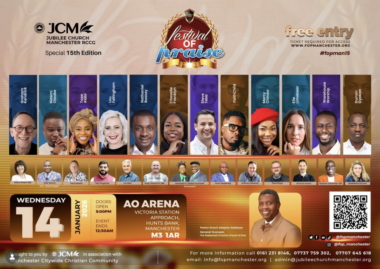 Festival of Praise Manchester is in its 15th Year! It is arguably North of England's largest Gospel Event, and you can't afford to miss it. New Year FOP Manchester 2026 Join us for an unforgettable New Year celebration, exhortation, and jubilation at the AO Arena in Manchester! Get ready to kick off the year alongside […]