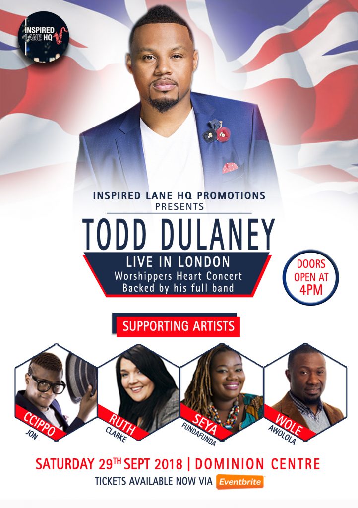 This Saturday, 29th September, at the Worshippers Heart Concert, Todd Dulaney will be performing in the UK for the first time ever at Dominion Centre in Wood Green. He will be accompanied by his full band and UK acts including Ccippo, Wole Awolola, Ruth Clarke plus more. This is a worship experience that is not to be missed.