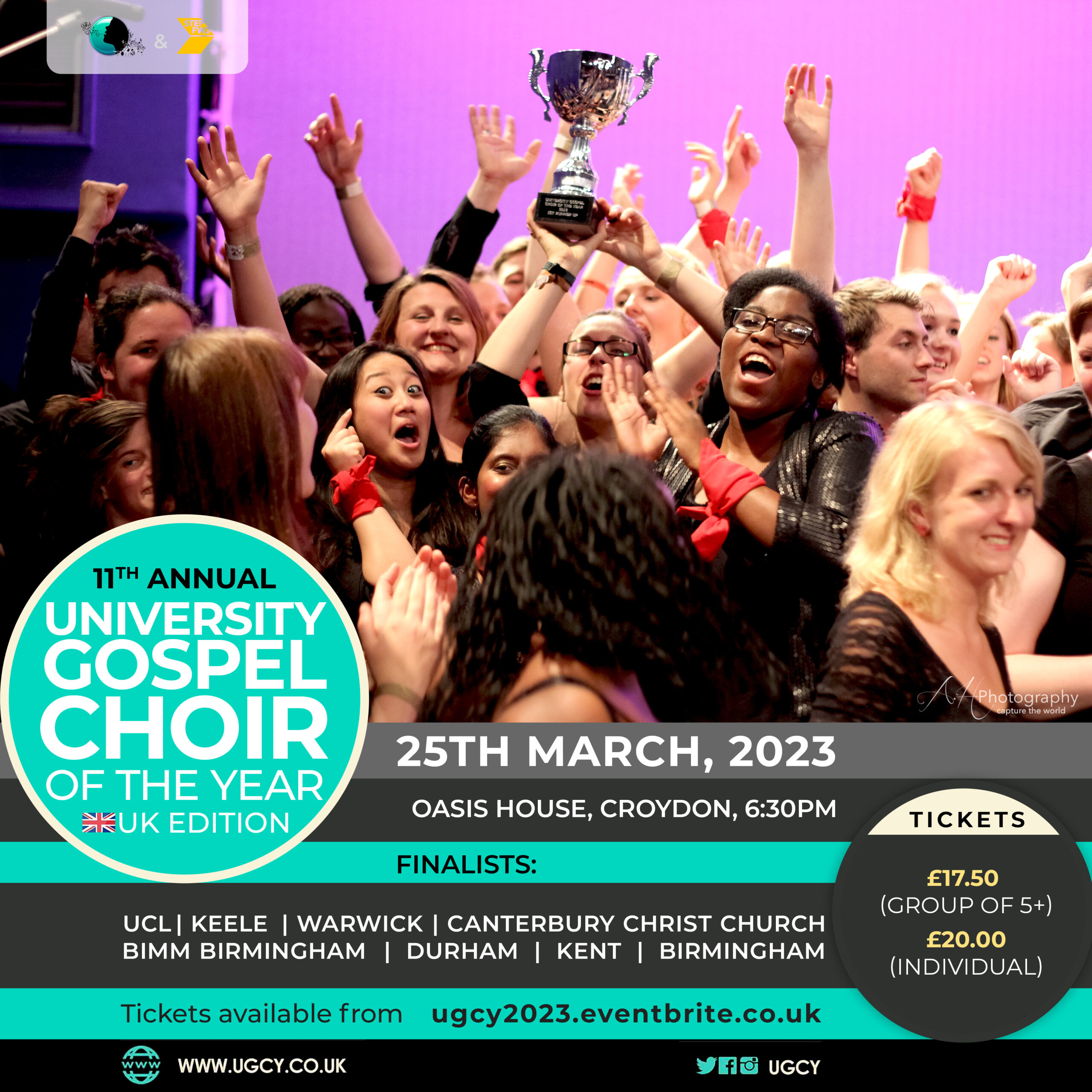 The University Gospel Choir of the Year will be held on Saturday 25th March 2023 at Oasis House, Croydon CR0 3EX with doors open from 6pm. TICKETS are now available and this event is not to be missed!